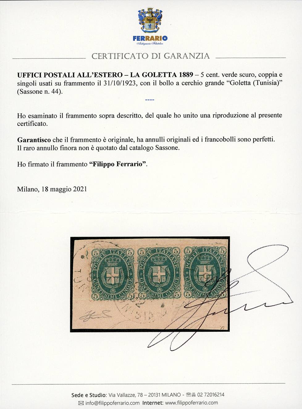 LA GOLETTA 1889 - 5 cent. Stemma, fondo pieno (Regno 44), coppia e singolo, perfetti, usati su frammento con il bollo a cerchio grande "Goletta (Tunisia)" 31/10/1892. Annullo molto raro, non quotato dal cat. Sassone. Fiecchi, cert. Ferrario.