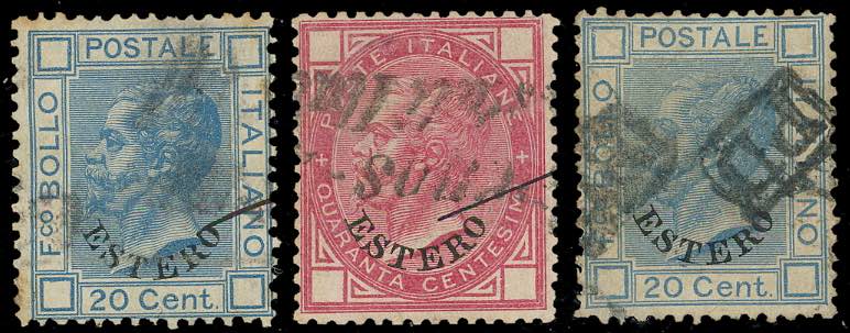 BUENOS AIRES 1874 - 20 cent. e 40 cent. soprastampati (5,7), perfetti, annullati con il lineare su due righe "Da Buenos Aires coi Postali Italiani", punti R1 e 20 cent. soprastampato (5), perfetto, annullato con un inedito e non catalogato bollo "PD" in cartella. Raro insieme.