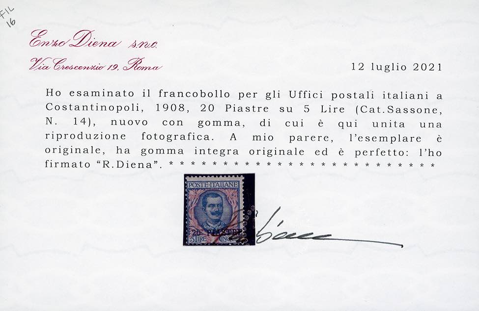 COSTANTINOPOLI 1908 - 4 p. su 1 lira, 20 p. su 5 lire II emissione locale (13/14), gomma originale integra, perfetti. Rari e di ottima qualità. Cert. Diena e Ferrario.