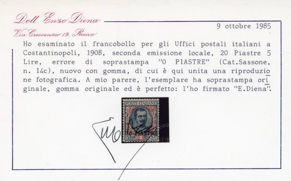 COSTANTINOPOLI 1908 - 20 piastre su 5 lire, II emissione locale, varietà "0 piastre" (14n), gomma originale, lieve traccia di linguella, perfetto e di ottima qualità. Rarissimo! Cert. E.Diena.
