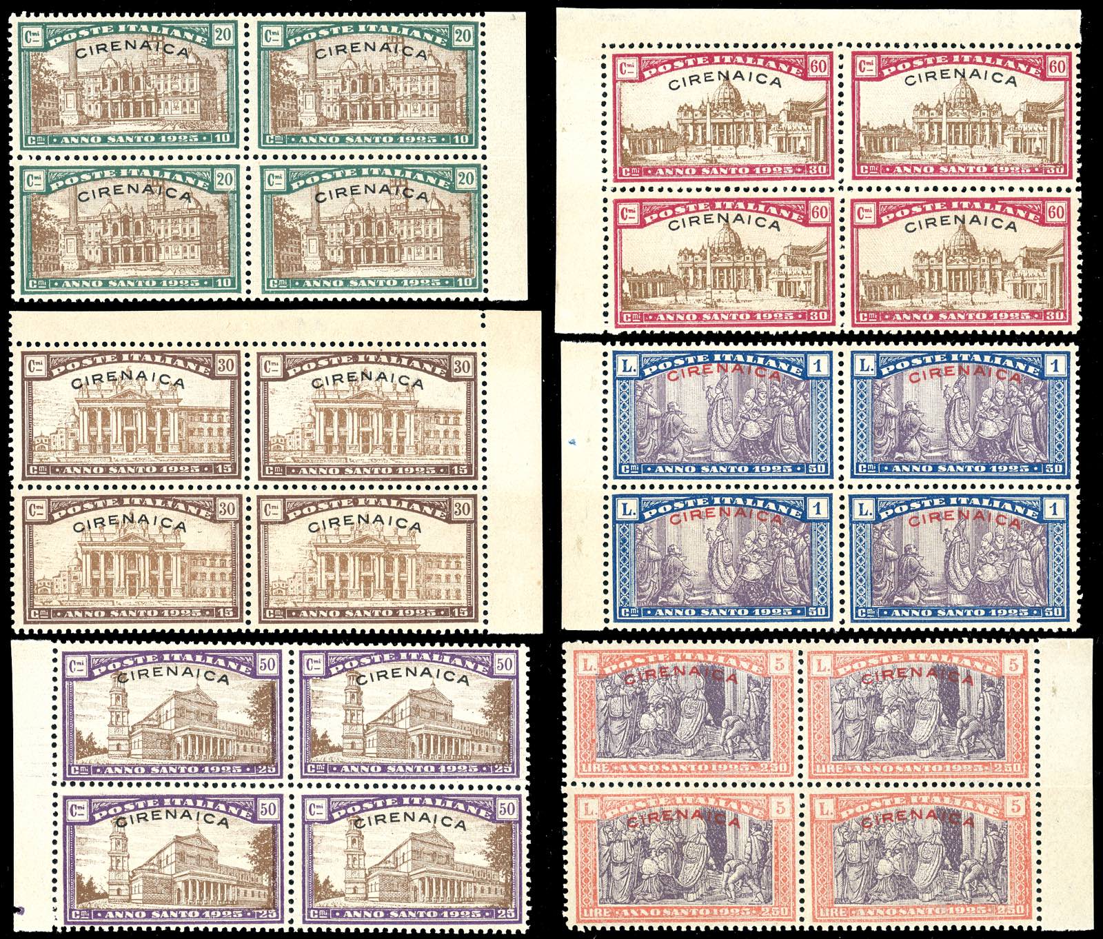 1925 - Anno Santo, serie completa (17/22), blocchi di quattro, angolo/bordo di foglio, gomma originale integra, perfetti. Belli.