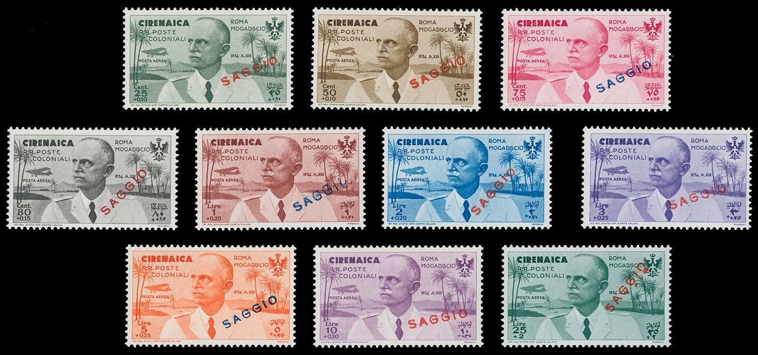 POSTA AEREA 1934 - Volo Roma - Mogadiscio, serie completa soprastampati "SAGGIO" (A30/A39), nuovi, gomma originale integra, perfetti. ... Leggi tutto