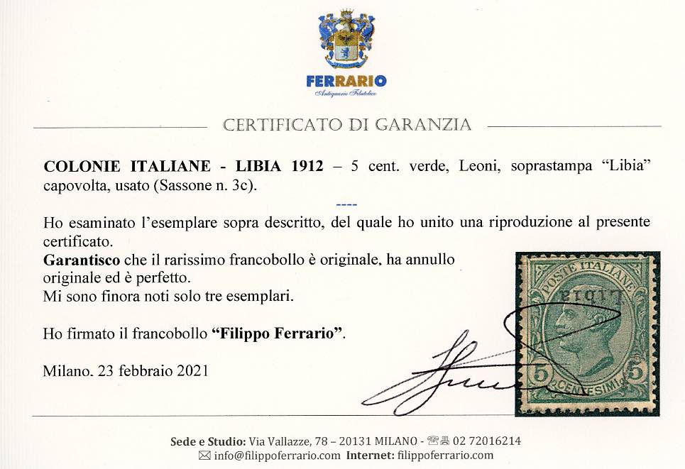 1912 - 5 cent. Leoni, soprastampa capovolta (3c), perfetto, usato. Rarissimo, TRE SOLI ESEMPLARI NOTI. Cert. G.Bolaffi, A.Diena, Ferrario.