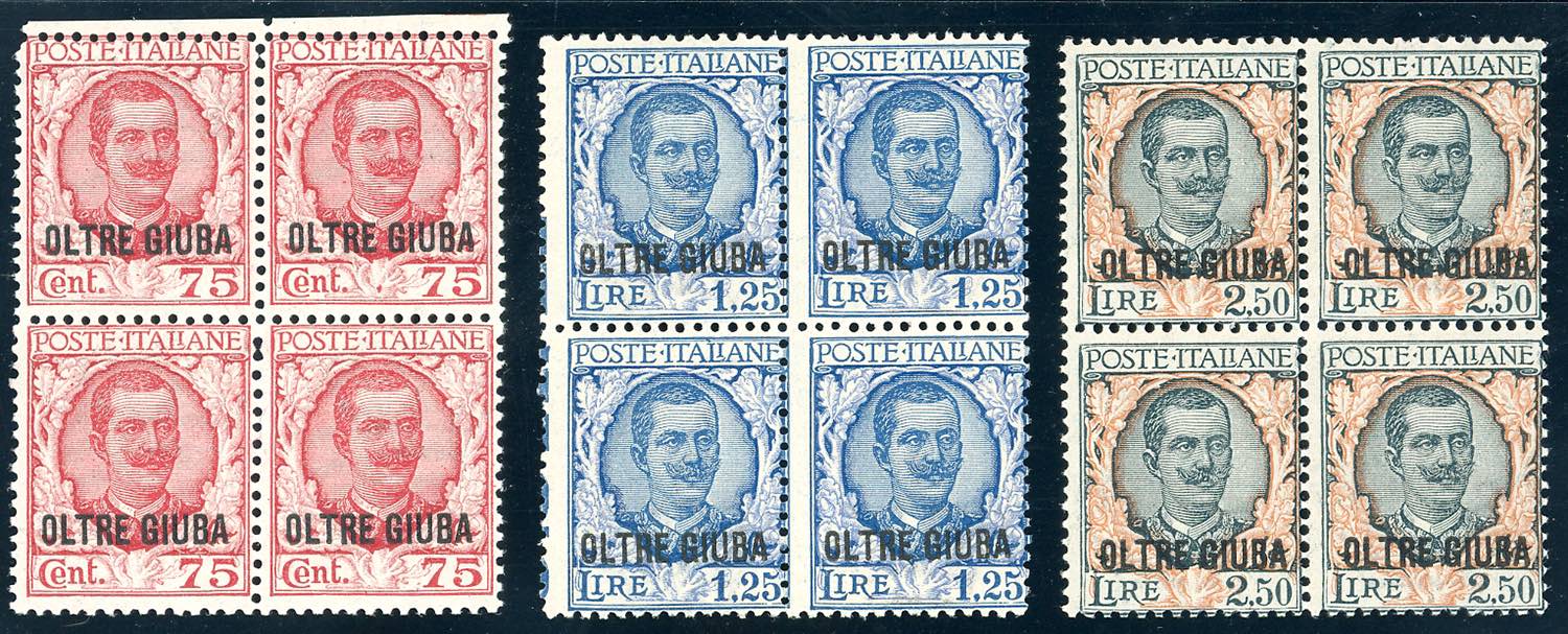 1926 - Soprastampati, serie completa (42/44), blocchi di quattro, gomma originale integra, perfetti. Ferrario.