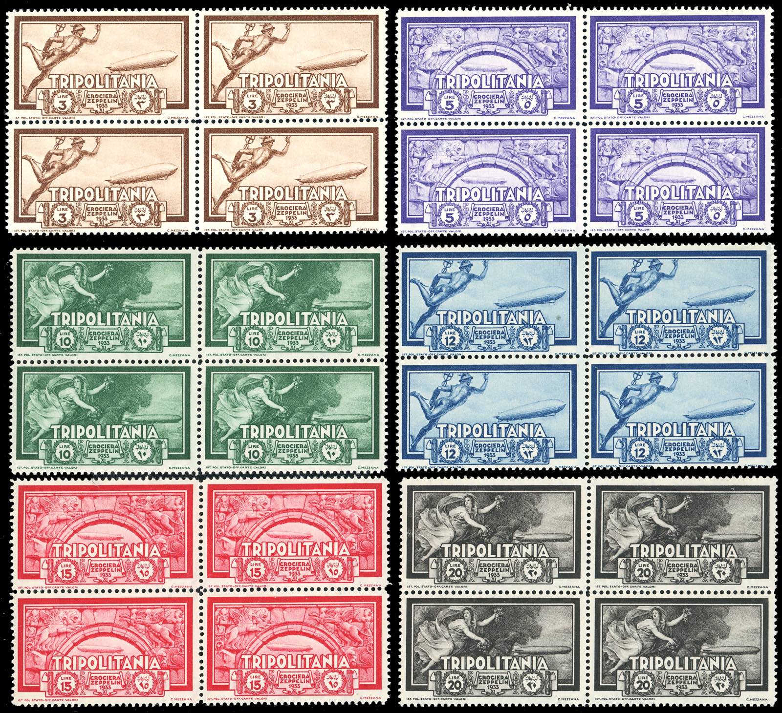POSTA AEREA 1933 - Zeppelin, serie completa (22/27), blocchi di quattro, gomma originale integra, perfetti. Splendidi.