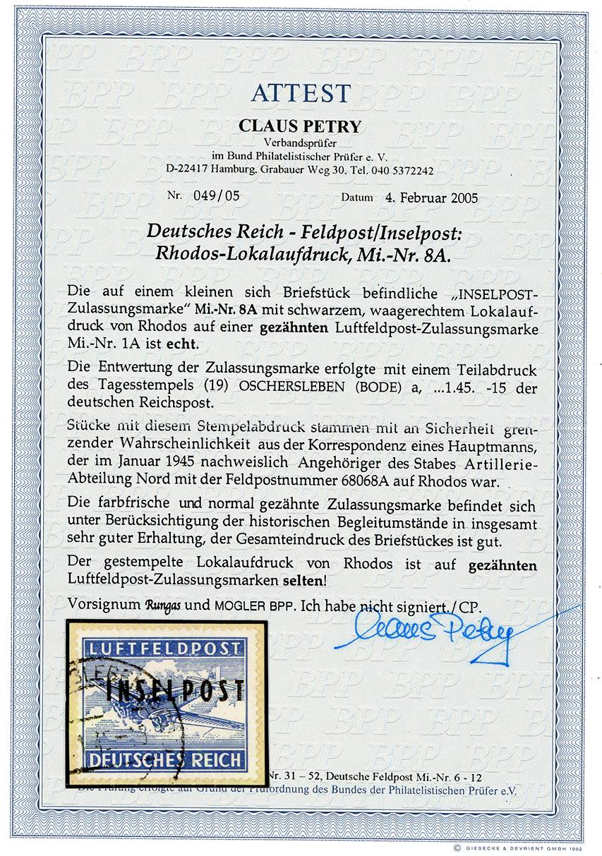 OCCUPAZIONE TEDESCA EGEO 1944 - Inselpost azzurro, emissione di Rodi, dent. 13 3/4 (4), perfetto, usato su piccolo frammento. Molto raro. Cert. Oro Raybaudi. e Petry.