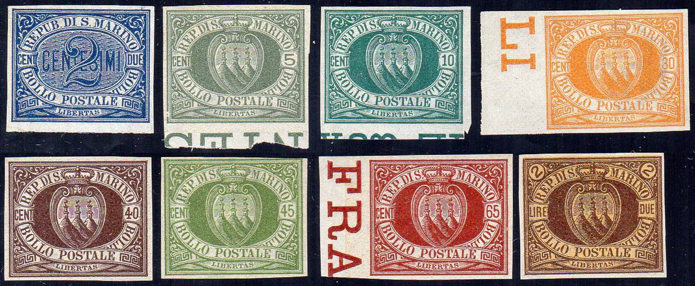 1892/94 - Cifra e stemma, prove d'archivio, otto valori (P12/P14,P16/P19/P21), non dentellato, senza gomma come sempre. Belle. A.Diena.