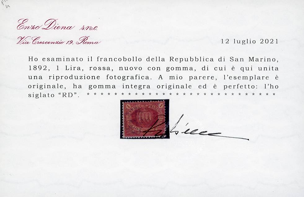 1892 - 1 lira carminio su giallo Stemma (20), disceta centratura, gomma integra, perfetto. Em.Diena, cert. Diena.