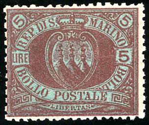 1892 - 5 lire Stemma (22), ottima centratura, gomma originale integra, perfetto. Bello e molto fresco. Cert. Ferrario.