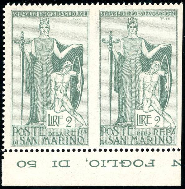 1924 - 2 lire Garibaldi (102), coppia orizzontale non dentellata al centro e a destra, bordo di foglio, gomma originale integra, perfetta. ... Leggi tutto