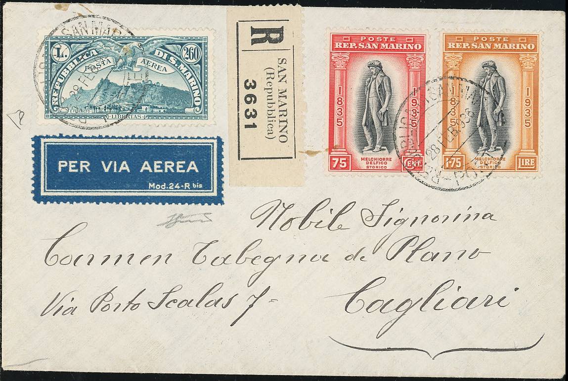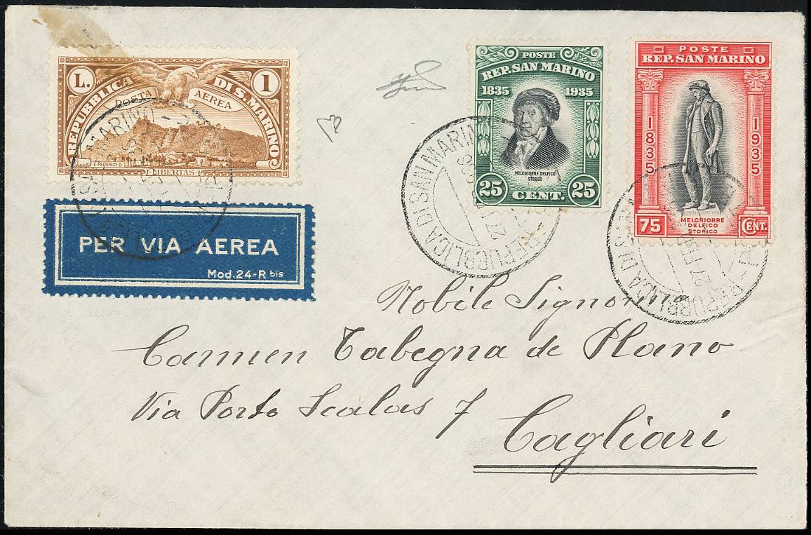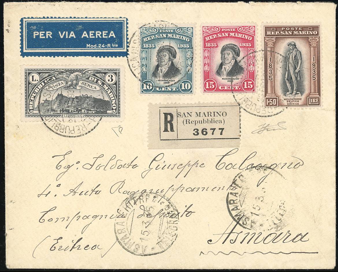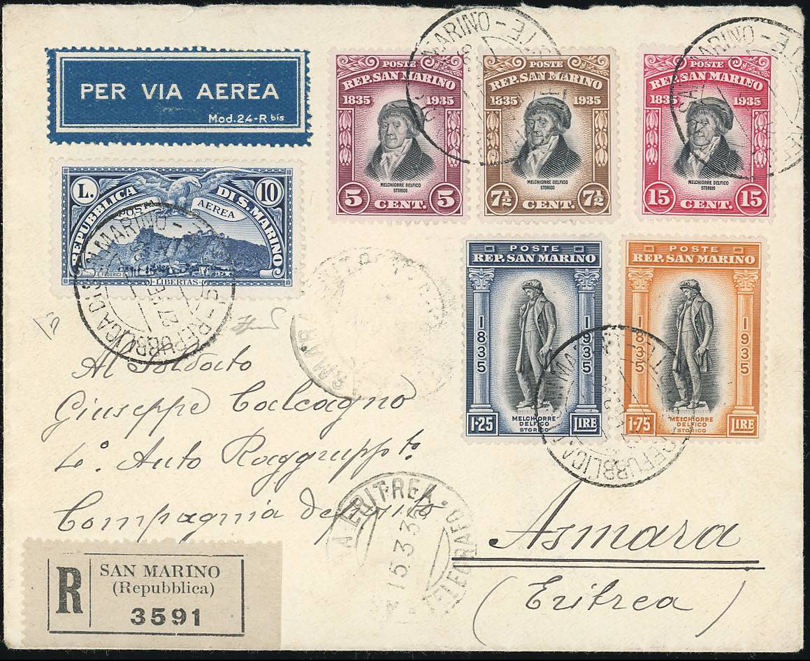 1936 - Veduta, serie completa (1/10), con complementari della serie Delfico, perfetti, su otto aerogrammi, sei dei quali raccomandati, spediti da San Marino nel febbraio/marzo 1936 ad Asmara o a Cagliari. Raro insieme. Ferrario, cert. E.Diena.