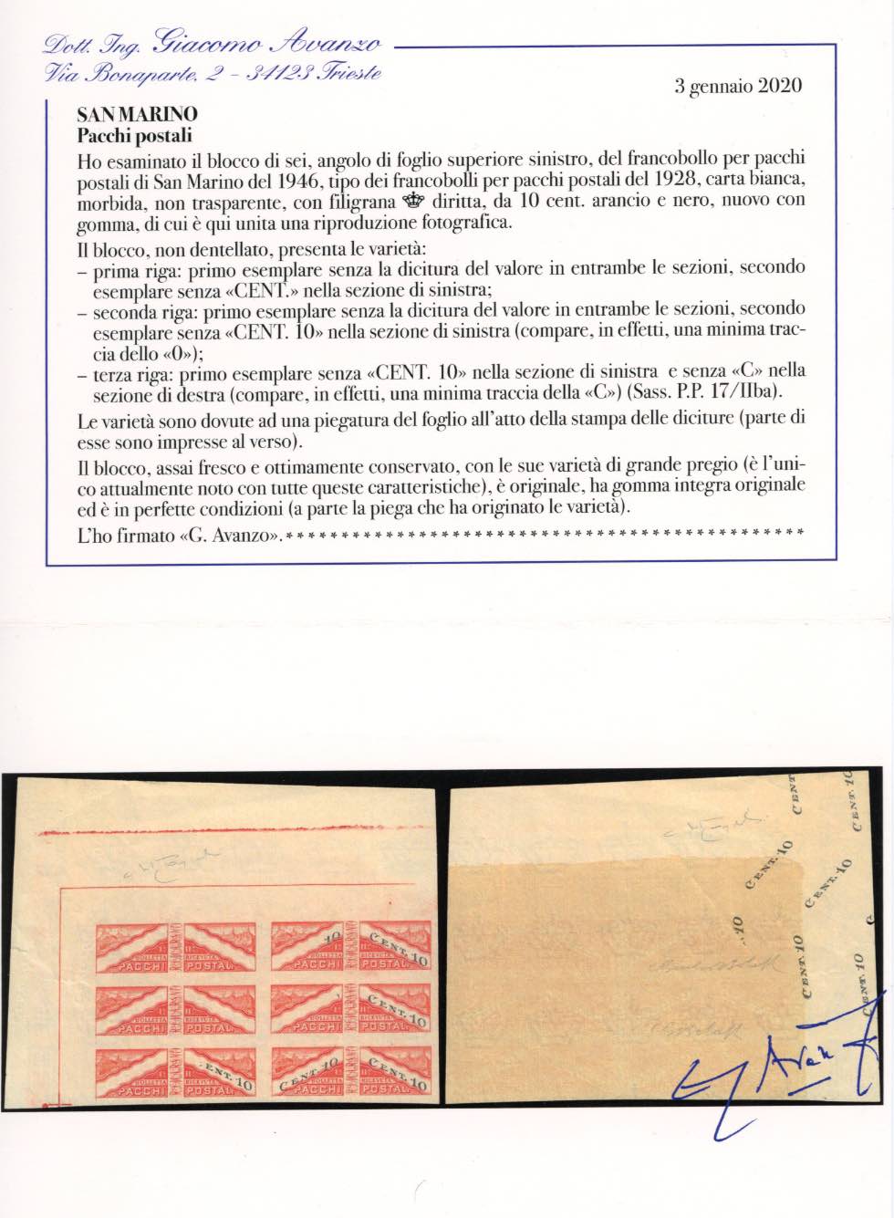 1946 - 10 cent., carta bianca, filigrana corona dritta, blocco di sei esemplari, due esemplari completamente senza la stampa del valore, tre esemplari con la stampa parziale, la parte mancante è impressa al verso (17/IIba), angolo di foglio, gomma originale integra, perfetto. INSIEME UNICO! G.Bolaffi, cert. Avanzo e Oro Raybaudi.