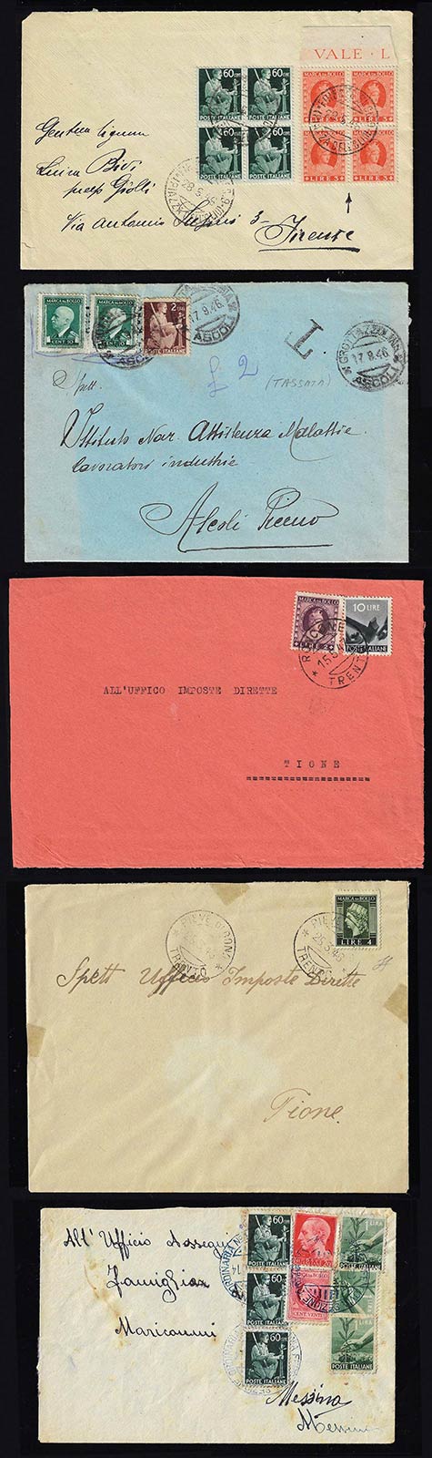 LUOGOTENENZA/REPUBBLICA ITALIANA 1946/1947 - Quattro lettere e un frontespizio, tutte affrancate con marche da bollo, quattro in affrancatura mista con Democratica. Interessanti.
