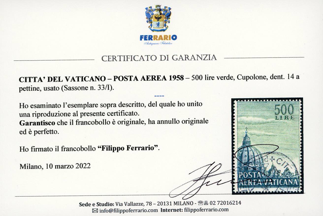1958 - 500 lire Cupolone, dent. 14 a pettine (33/I), usato, perfetto. A.Diena, cert. Ferrario.