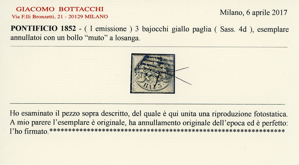 STATO PONTIFICIO 1852 - 3 baj, sette esemplari di differenti tonalità, usati, tutti classificati e firmati Manzoni, e una lettera. Notato 3 baj giallo paglia (4d), cert. Bottacchi. Buon valore di catalogo, ottima qualità.