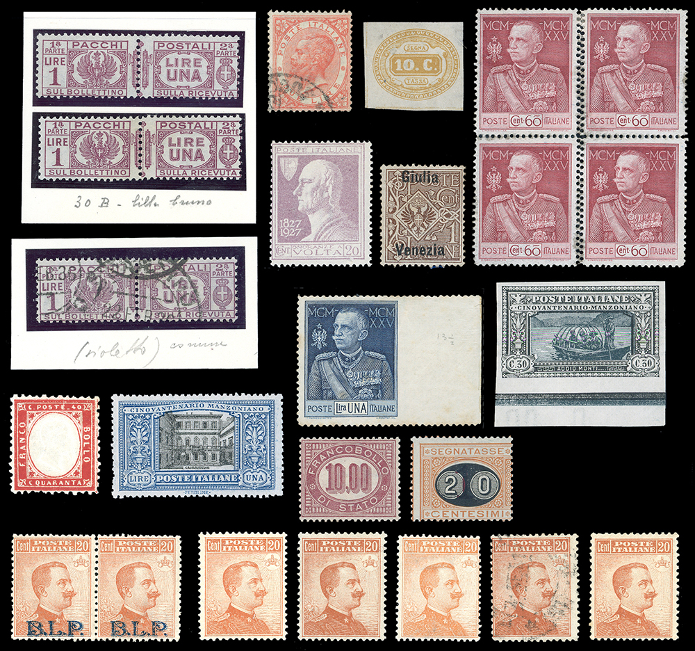 REGNO D'ITALIA 1921/1928 - Piccolo insieme di francobolli e varietà del periodo. Notato un Volta violetto (210A) difettoso e due certificati.