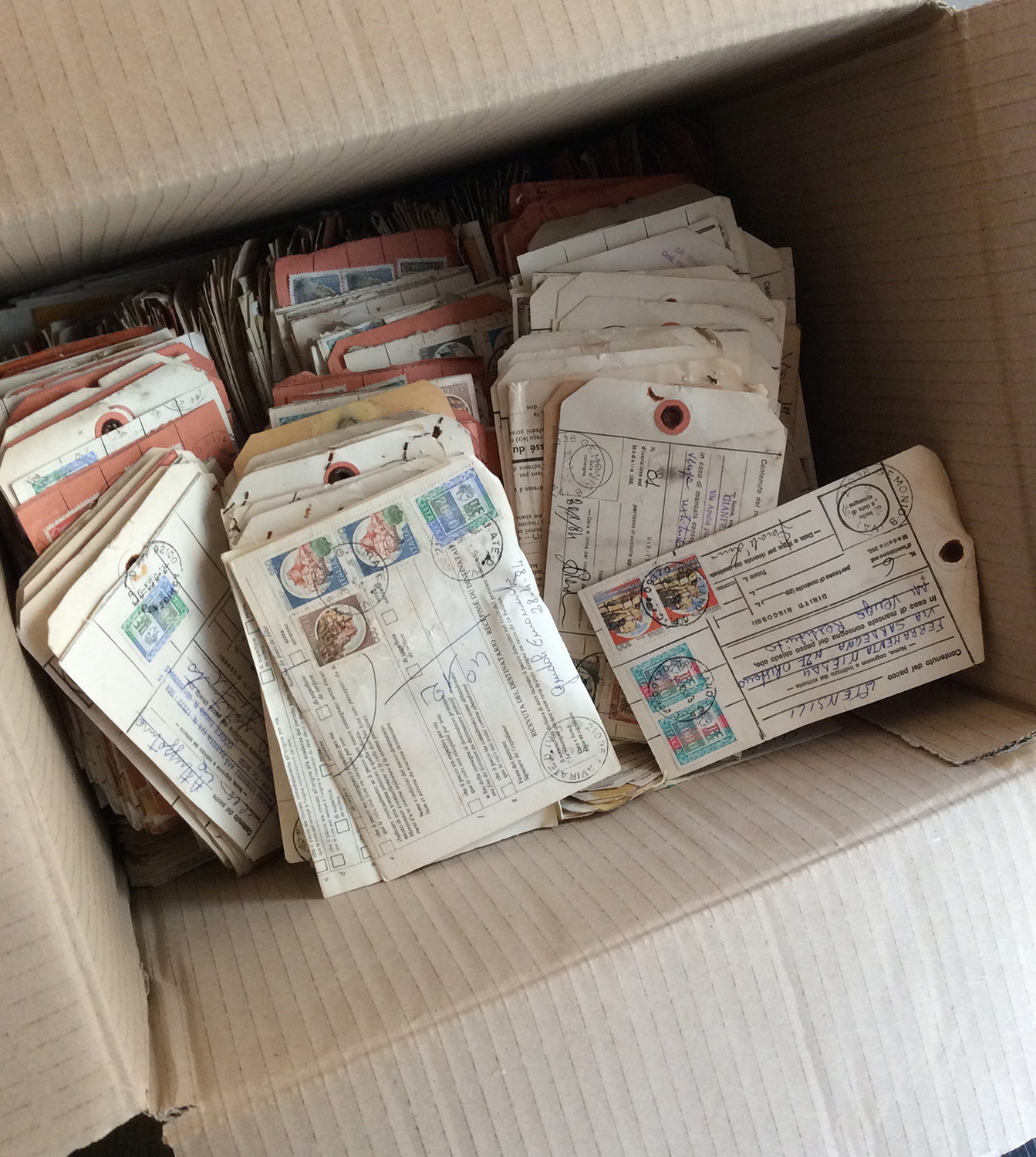 REPUBBLICA ITALIANA 1970/1990 ca - Scatolone contenente un'enorme accumulazione di bollettini pacchi italiani, affrancati con commemorativi, ordinari e pacchi postali interi. Ottimo per studio e dettaglio.