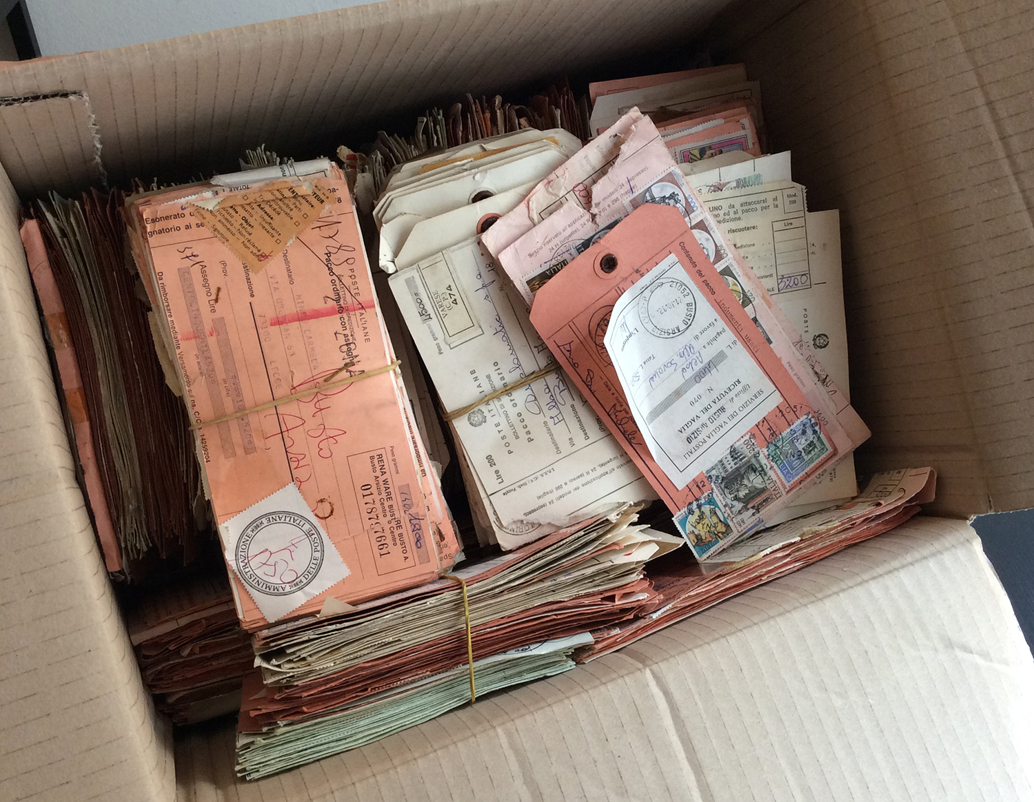 REPUBBLICA ITALIANA 1975/1990 - Scatolone contenente un'enorme accumulazione di bollettini pacchi italiani, affrancati con commemorativi ed ordinari del periodo. Molte interessanti presenze. Ottimo per studio e dettaglio.