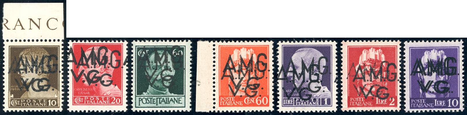 TRIESTE AMG-VG 1945 - Bell'insieme di sette esemplari, tutti con doppia soprastampa (1e,4ea,6e,7e,8e,9e,11e), gomma originale integra, perfetti.