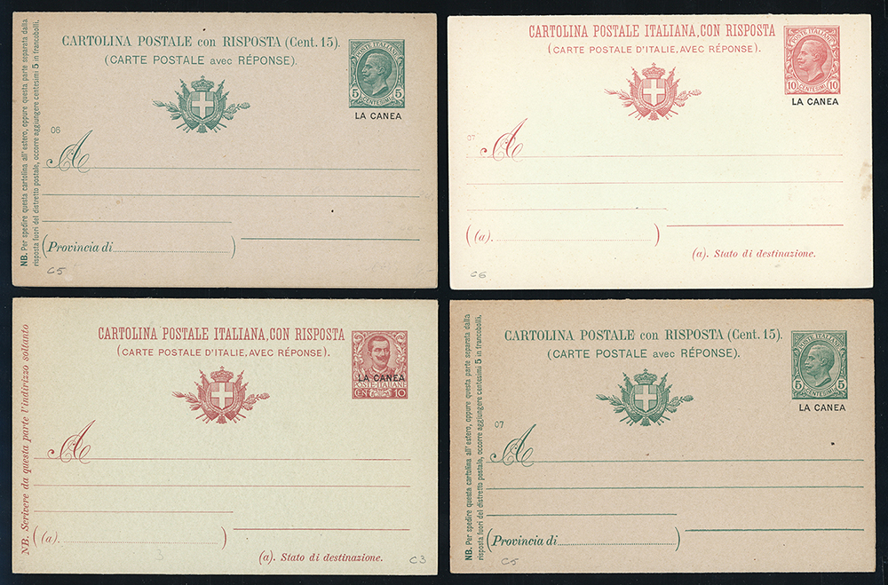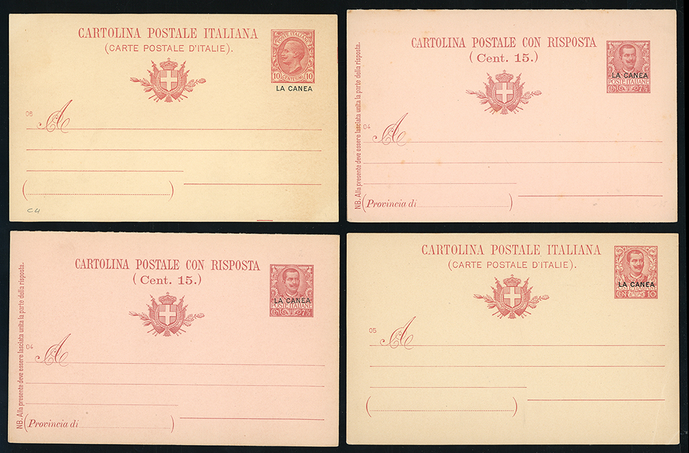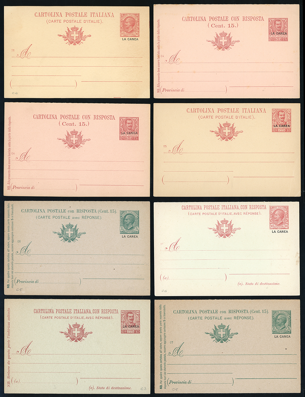 UFFICI POSTALI ALL'ESTERO LA CANEA INTERI POSTALI 1906/1907 - Splendido insieme di otto interi postali nuovi, perfetti, tutti di ottima qualità, Filigrano n. 1,2a(x2),3,4,5,5-07,6.