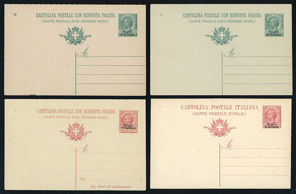 UFFICI POSTALI ALL'ESTERO TRIPOLI DI BARBERIA INTERI POSTALI 1909/1910 - Lotto di quattro interi postali, Filagrano n. 1,2,2A e 3. Ottima qualità.