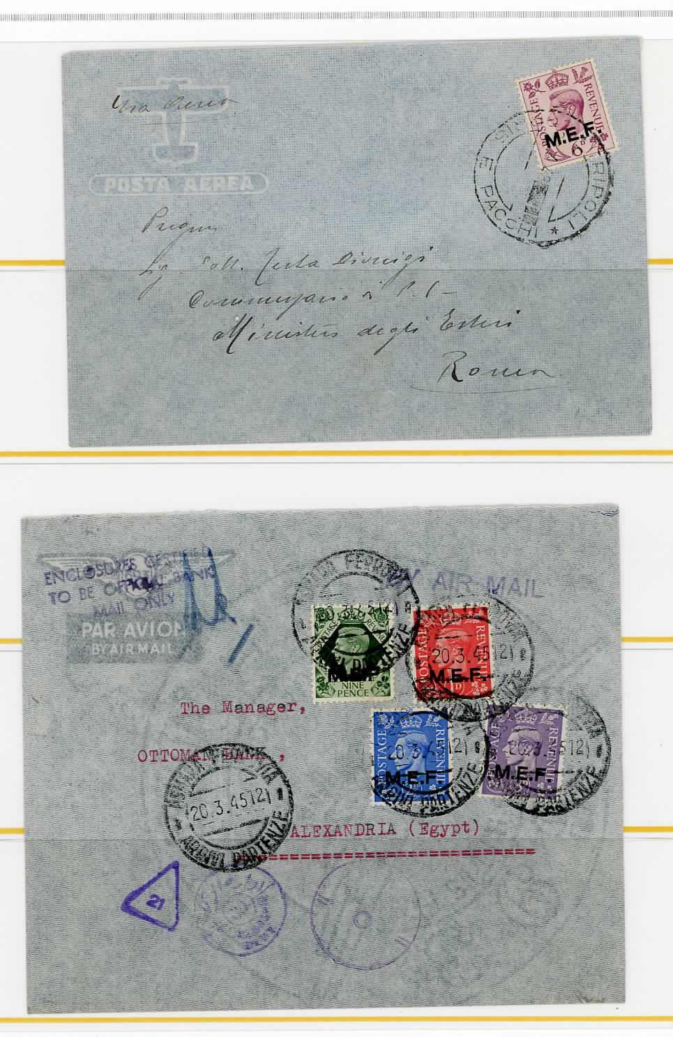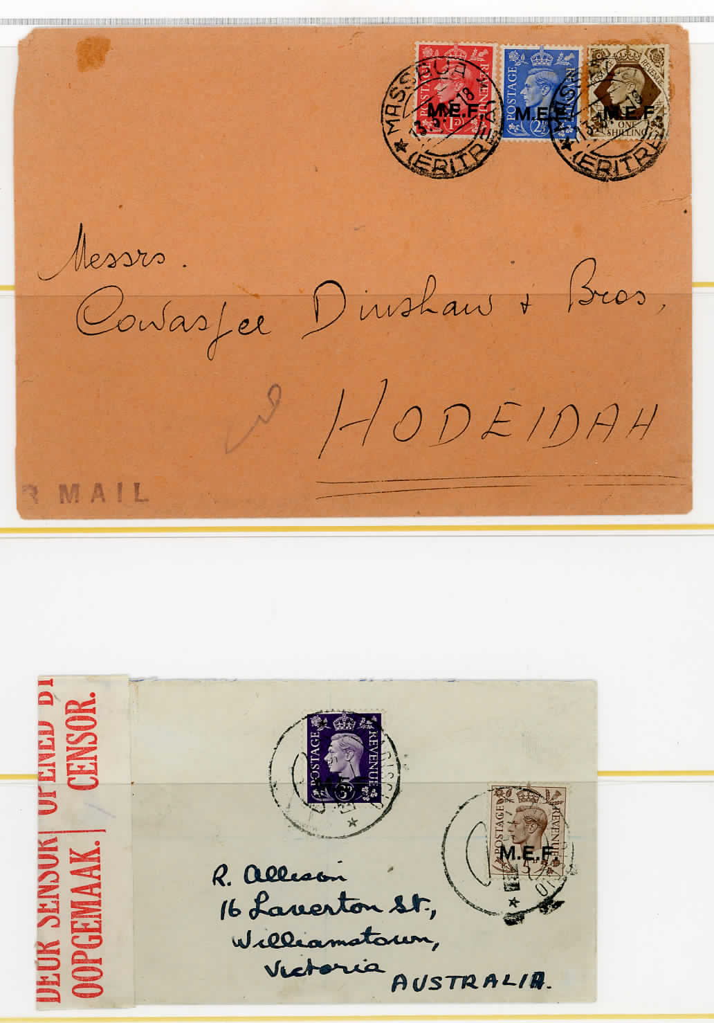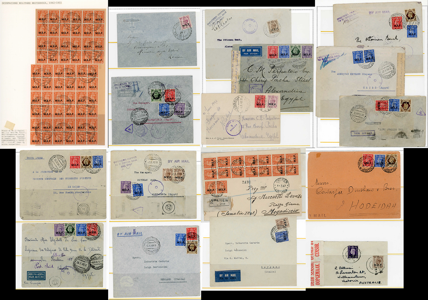 OCCUPAZIONE BRITANNICA M.E.F. 1942/1948 - Bell'insieme di sedici lettere variamente affrancate con i francobolli soprastampati. Notate interessanti e rare destinazioni, tra cui Yemen e Australia. E' presente anche un foglio usato, diviso in due blocchi, del francobollo da 2 p. Merita esame.