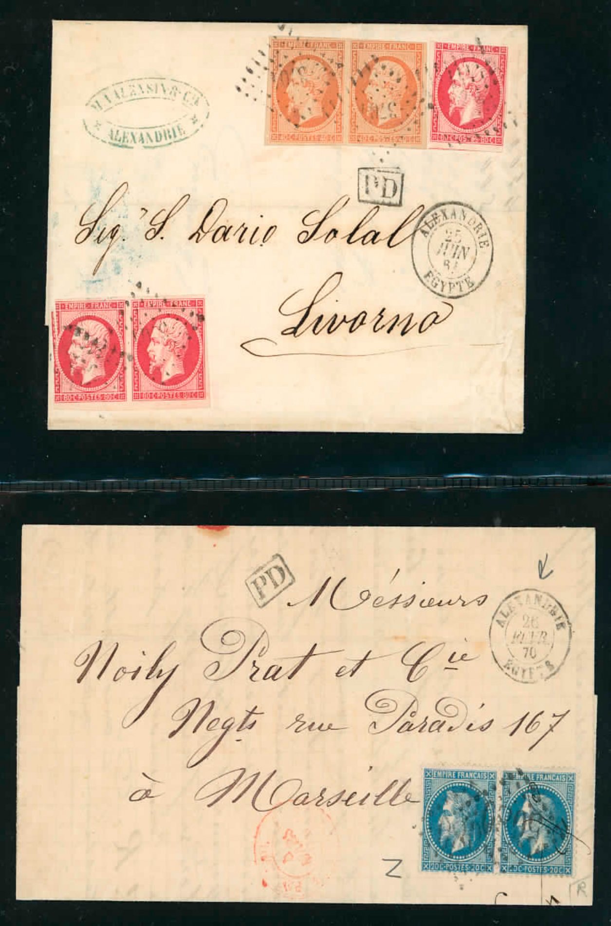 FRANCIA UFFICIO POSTALE ALESSANDRIA D'EGITTO 1848/1902 - Ben avviata collezione del settore comprendente dieci lettere affrancate e tre documenti del periodo. Notate diverse rare affrancature pluricolori, di ottimo aspetto. Merita esame, ottimo anche per dettaglio.