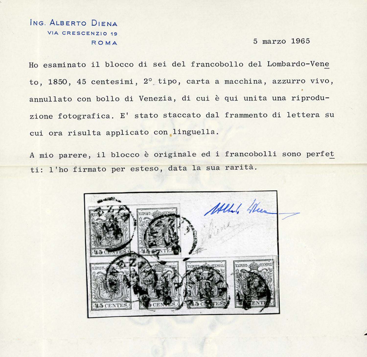 1856 - 45 cent. azzurro vivo, carta a macchina (22a), eccezionale blocco di 6 esemplari usati a Venezia 18 agosto, perfetti. Insieme del tutto raro e molto fresco. Emilio Diena, cert. A.Diena.