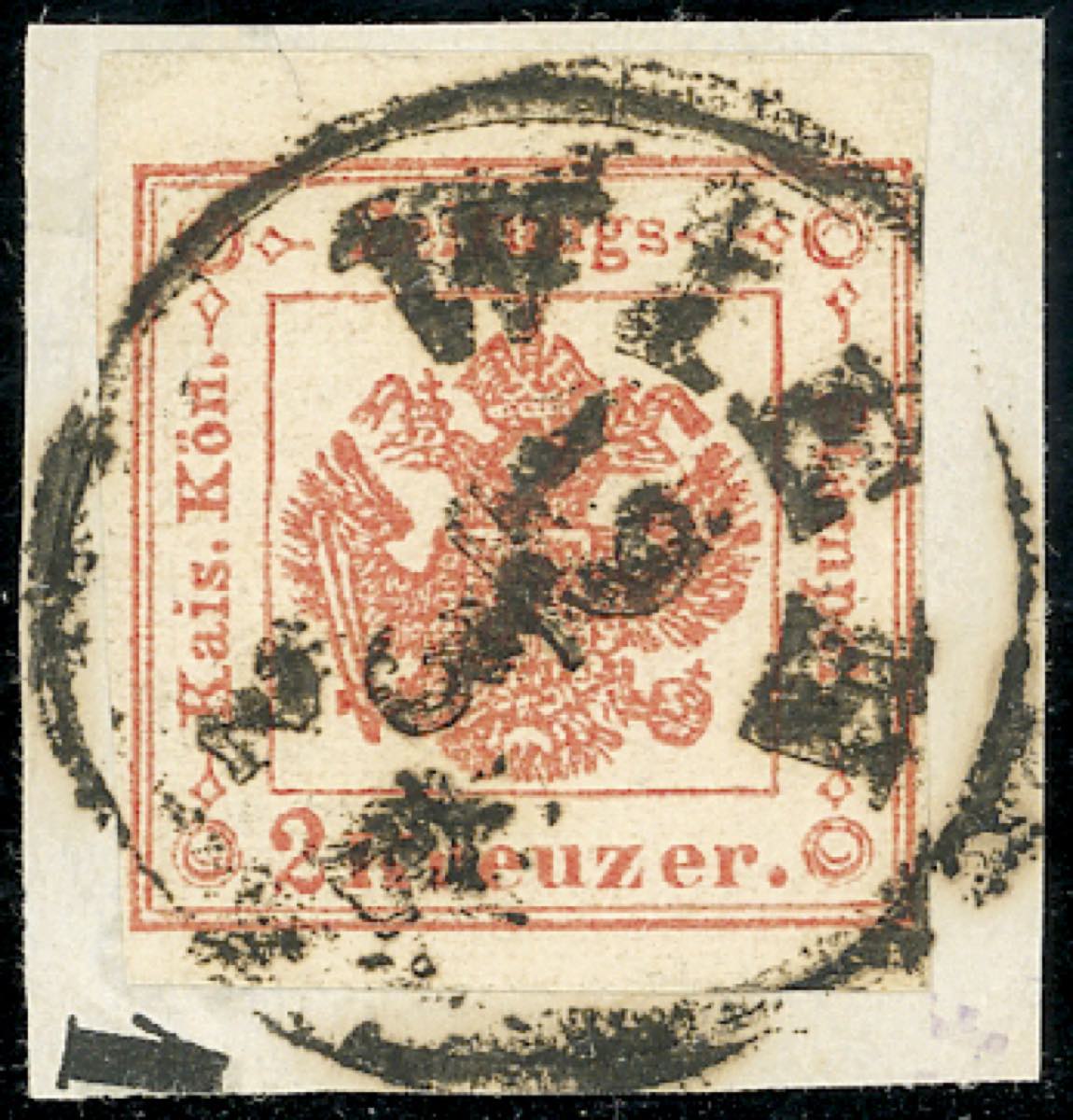 Lotto 71 - 1859 - 2 kr. vermiglio (3), perfetto, usato su frammento a ...