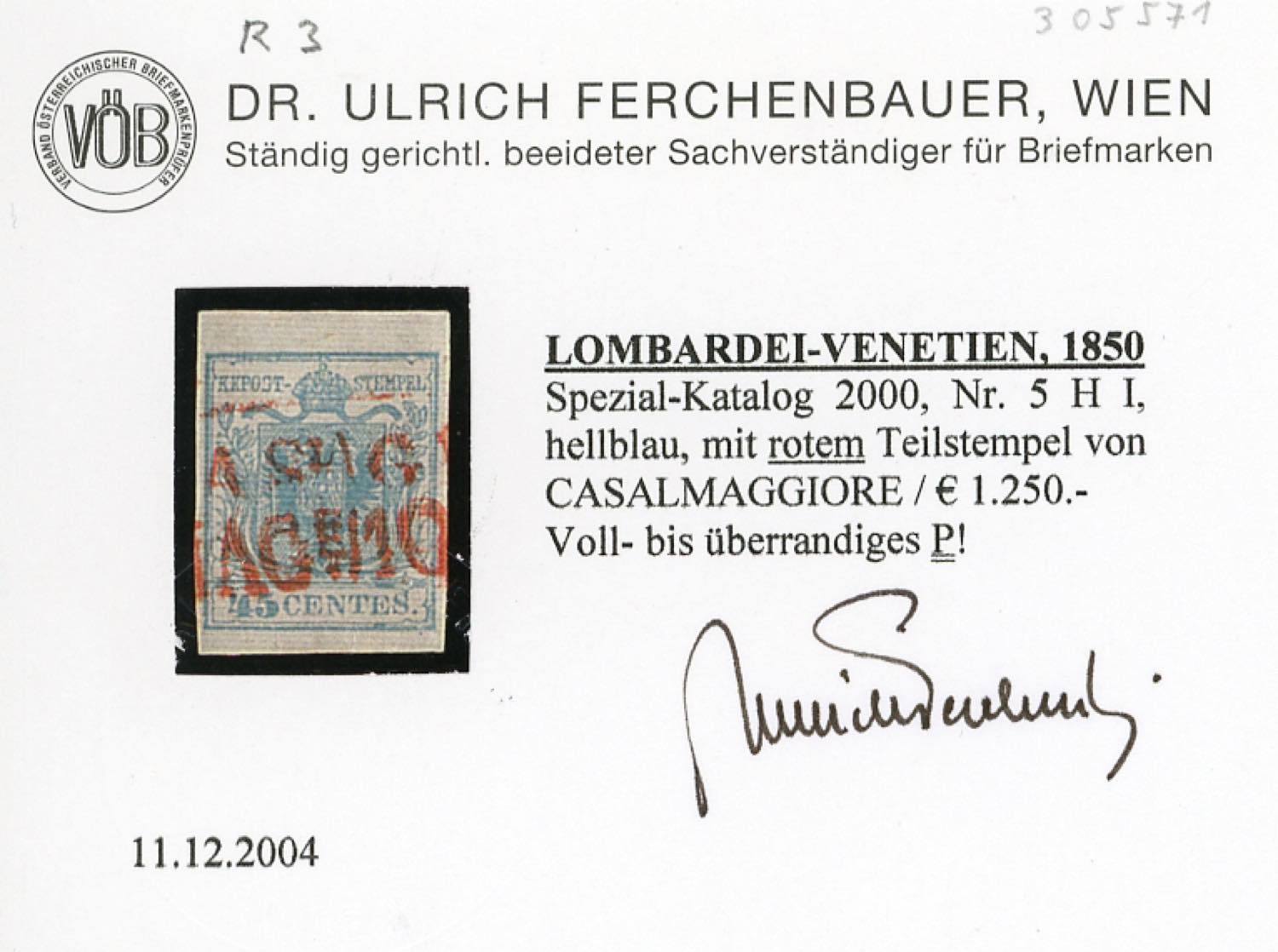 CASALMAGGIORE, Rd rosso punti R3 - 45 cent. (10n), perfetto, usato con il bollo in inchiostro rosso. Molto raro, specie su questo valore. Cert. Ferchenbauer.