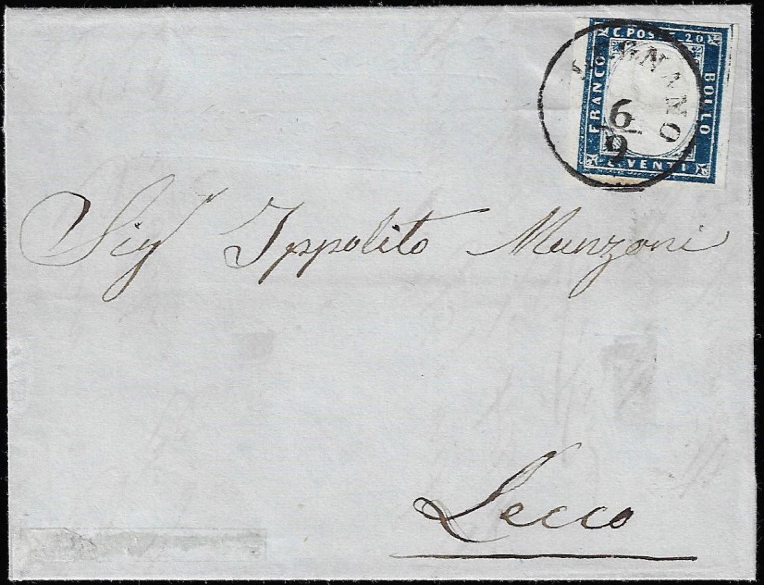 MELEGNANO, C1 punti 13 - 20 cent. (15B), lieve piega orizzontale, su lettera del 6/9/1859 per Lecco. Rara! Cert. Diena.