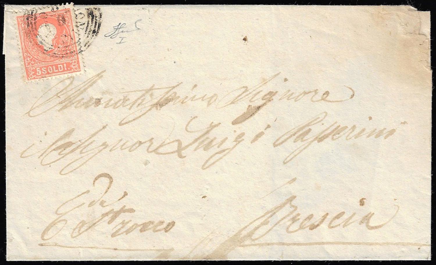 MONTICELLO, C4 punti 11 - 5 soldi (25), perfetto, su sovracoperta di lettera del 8/12/1858 per Brescia, bollo d'arrivo. Rara! Ferrario.
