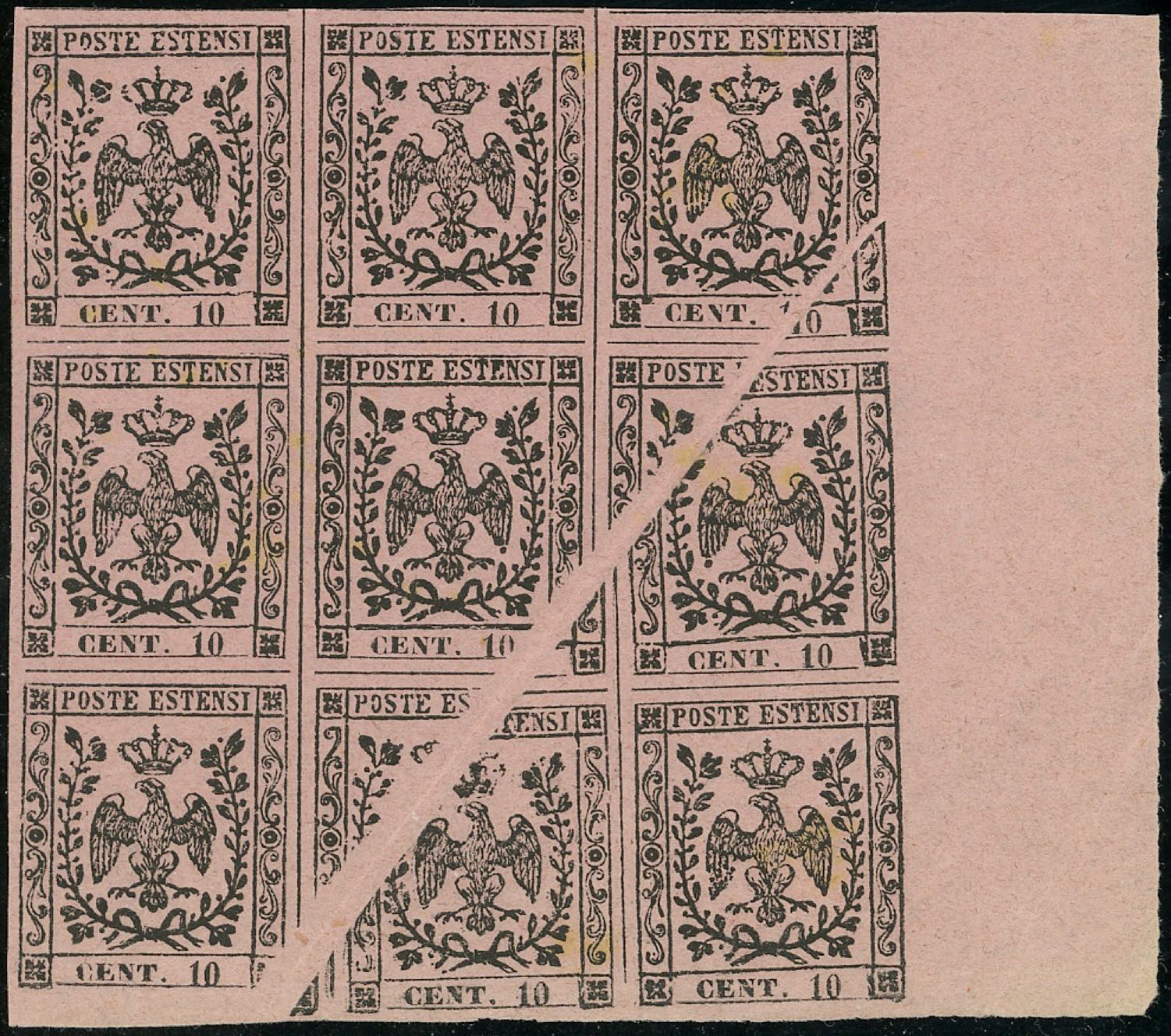 Lotto 136 - 1852 - 10 cent. rosa vivo (2a), blocco di nove bordo di ...