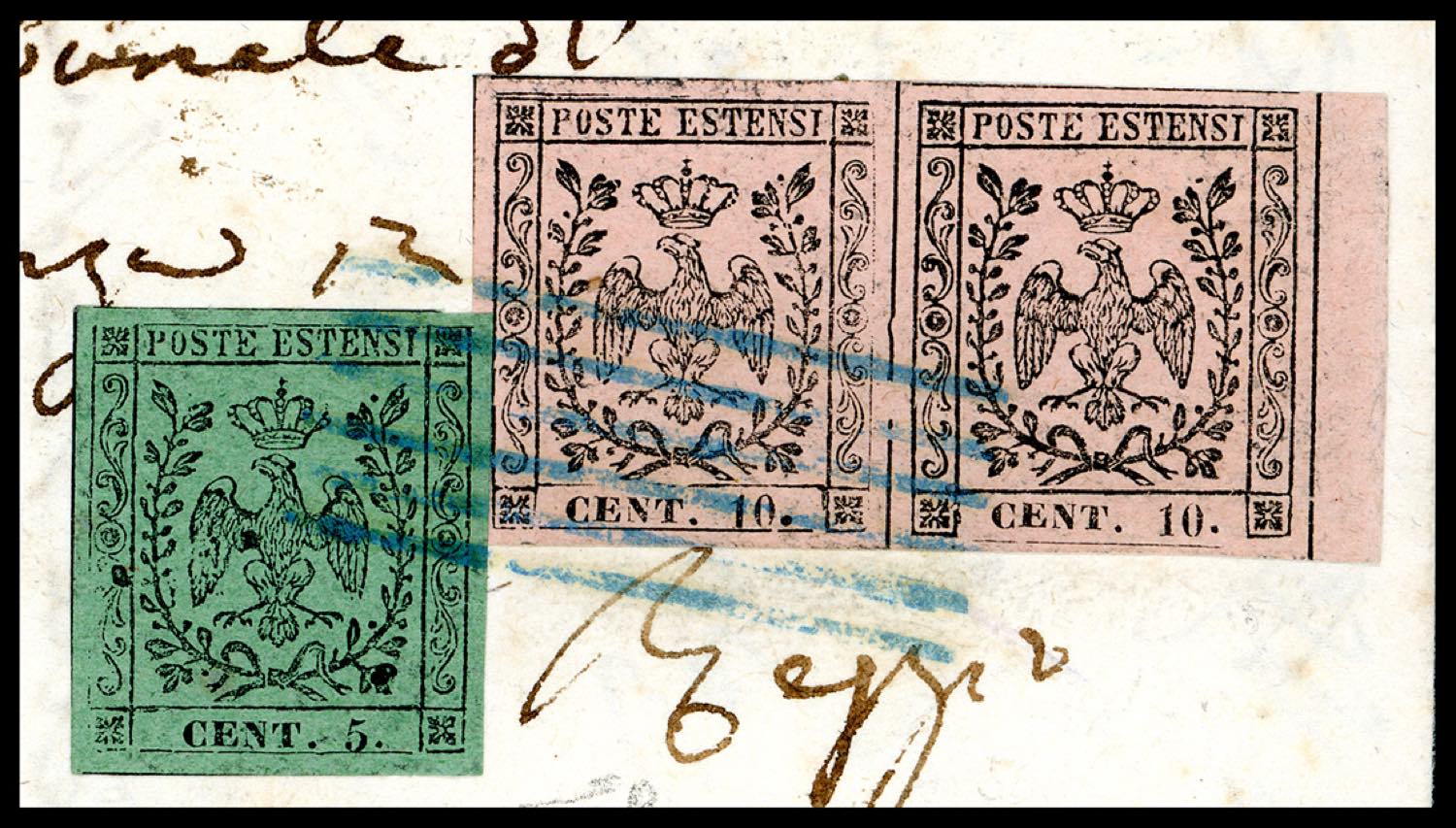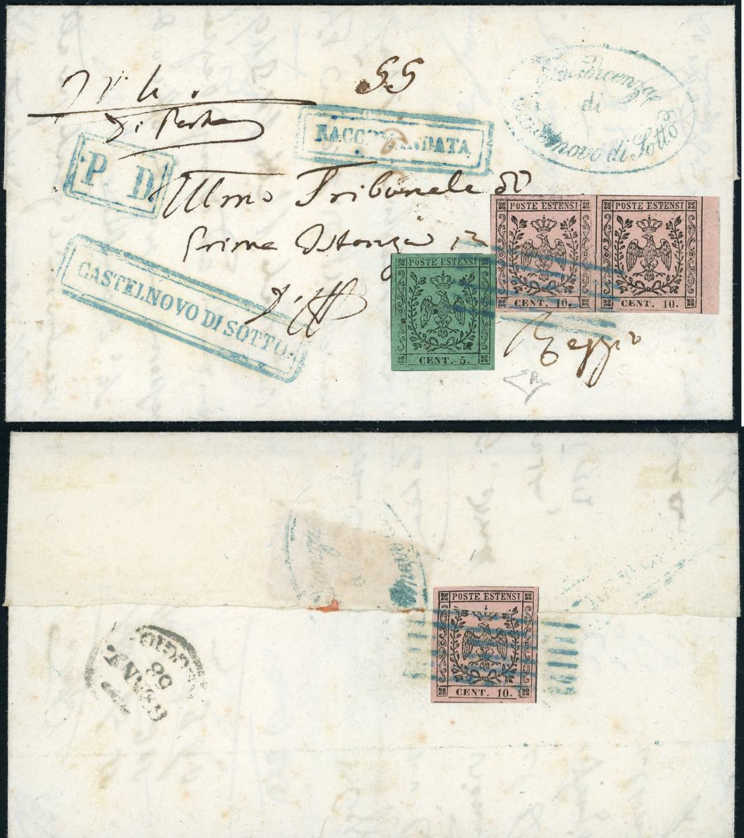 1858 - 10 cent. rosa, coppia orizzontale, bordo di foglio, un esemplare con varietà tipografica punto grosso dopo la cifra, perfetta, e singolo al verso (danneggiato all'apertura), 5 cent. verde, perfetto, tutti con punto dopo le cifre (9,7), su lettera raccomandata da Castelnuovo di Sotto 16/1/1858 (punti 12) a Reggio. Insieme probabilmente unico, di eccezionale freschezza. Cert. E.Diena.