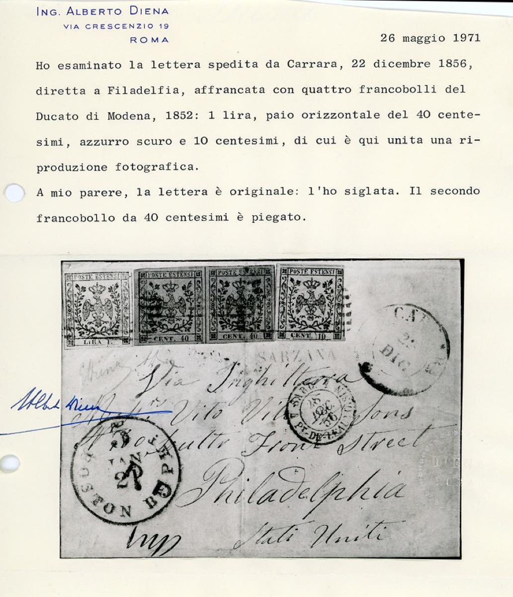 1856 - 1 lira bianco, perfetto, 10 cent. rosa, 40 cent. azzurro scuro, coppia, un esemplare con piega verticale (11,2,6), su lettera da Carrara 22/12/1856 per gli Stati Uniti. Rara! Emilio Diena, cert. A.Diena.