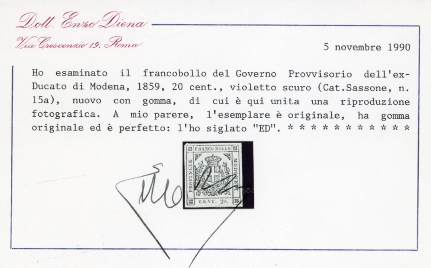 1859 - 20 cent. violetto scuro (15a), gomma originale, perfetto. Cert. Diena.