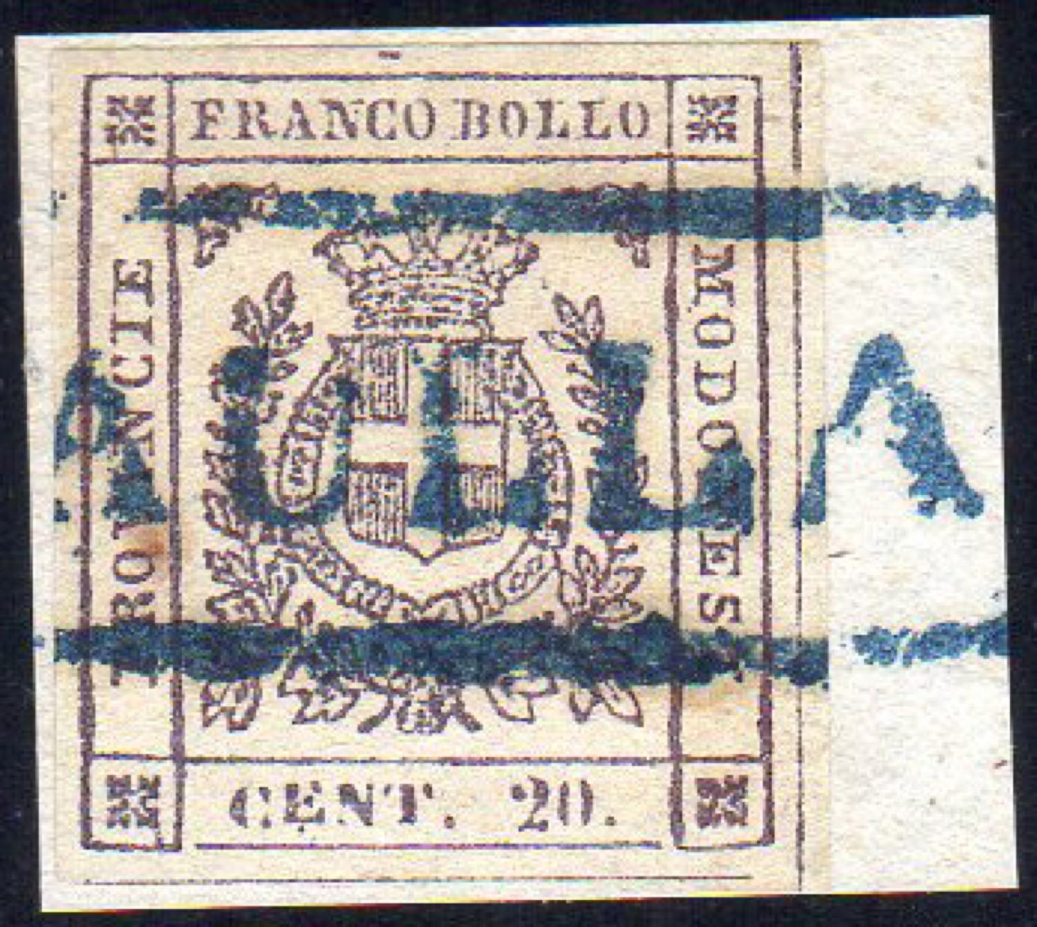 AULLA, cartella azzurra punti R1 - 20 cent. (16a), perfetto, usato su piccolo frammento. Mondolfo, cert. Colla.