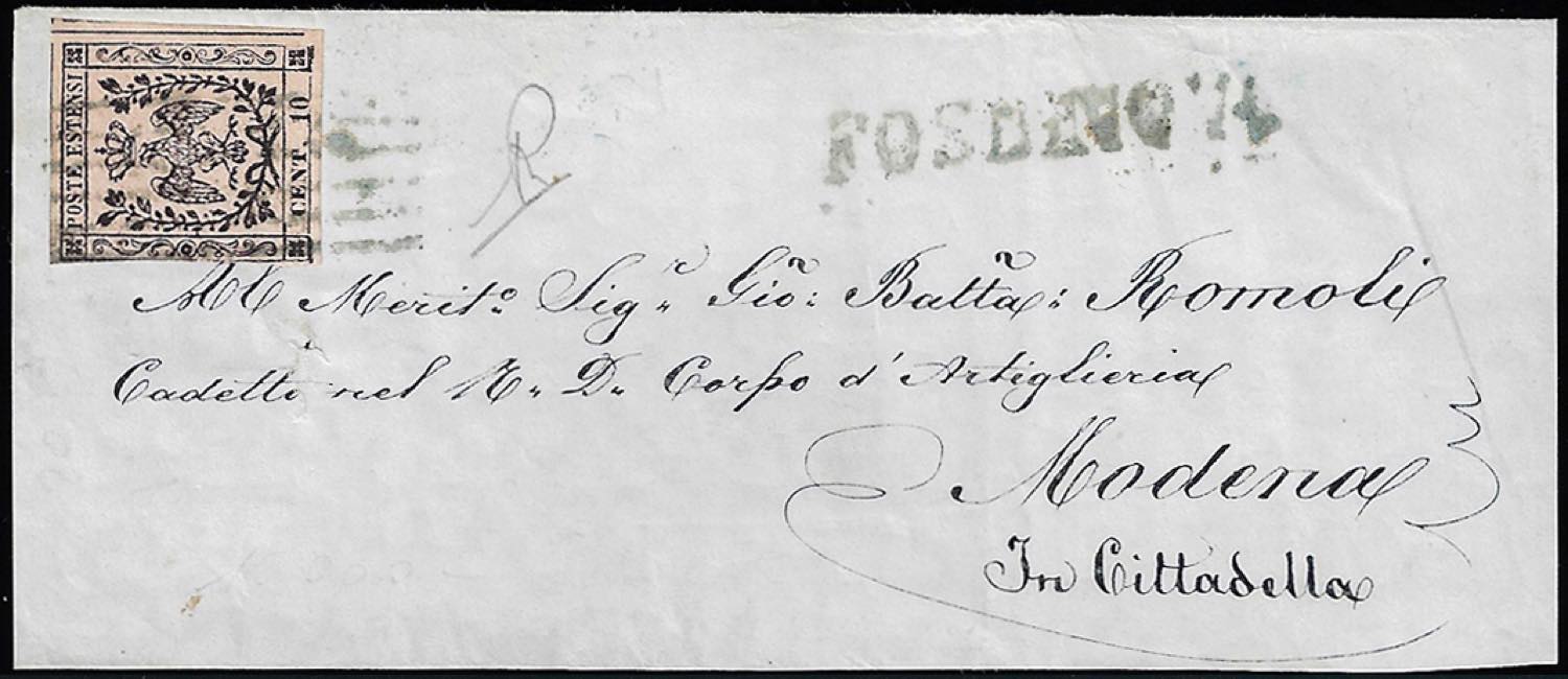 FOSDINOVO, 6 sbarre + lineare azzurri punti R1 - 10 cent. (2), giusto a sinistra, su frontespizio completo di lettera con parte del verso, INDIRIZZATA AD UN MILITARE, per Modena, bollo di arrivo 4/3/1857.