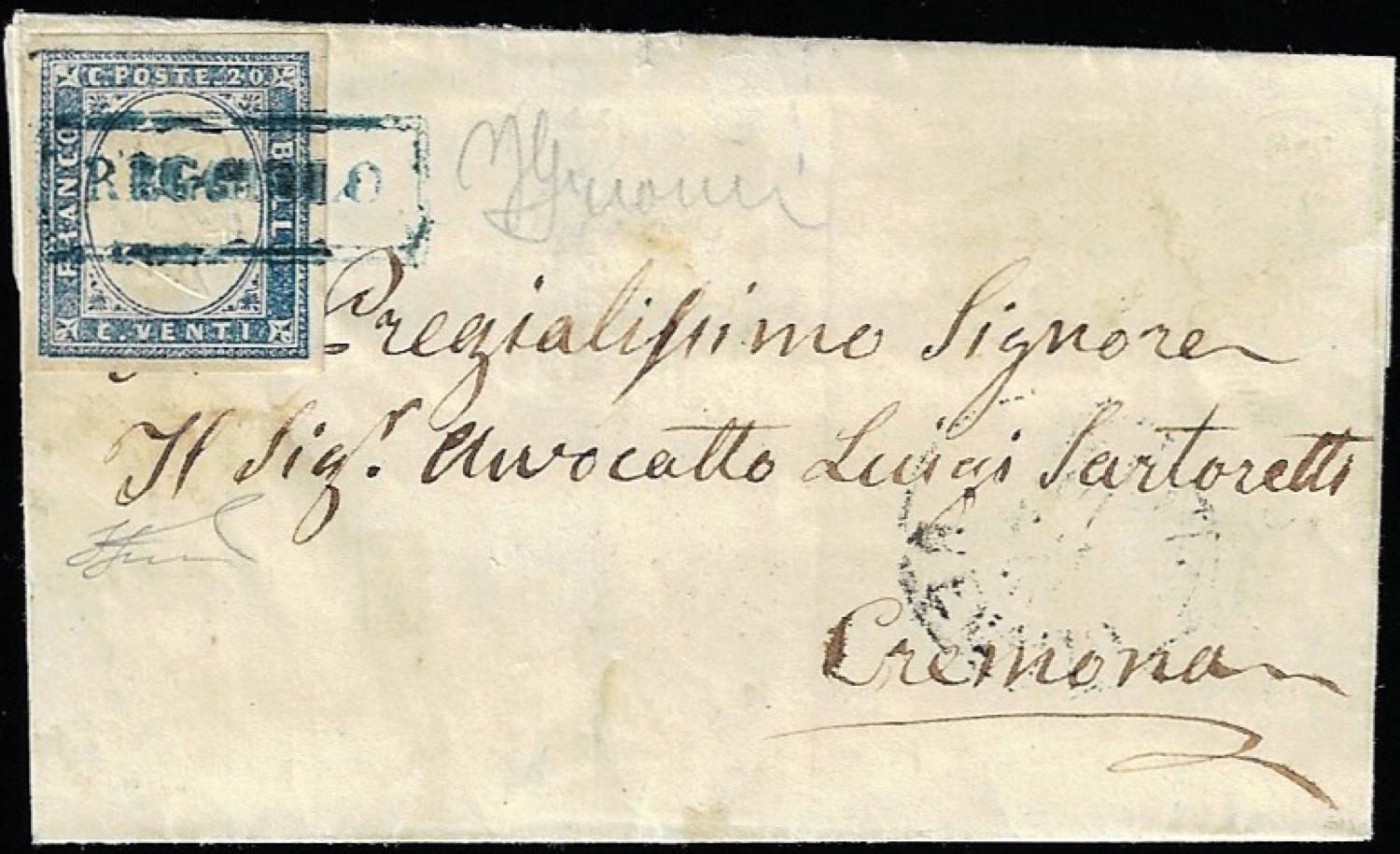 REGGIOLO, cartella azzurra punti 9 - 20 cent. (15Db), perfetto, su sovracoperta di lettera per Cremona, 25/6/1861. Grioni, Ferrario.