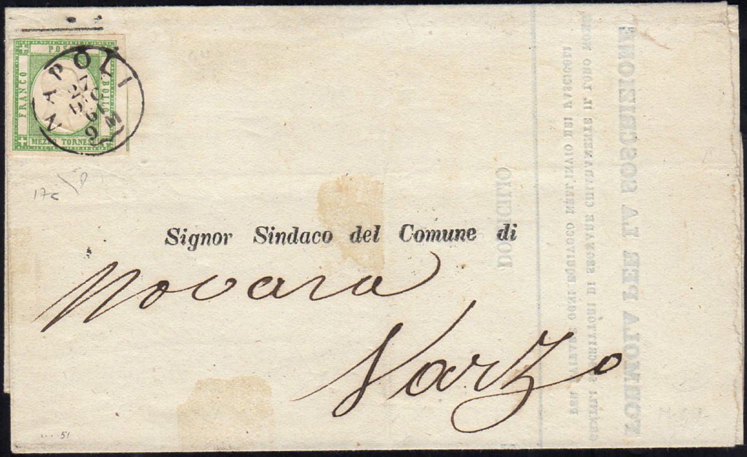 1861 - 1/2 tornese verde scuro (17c), perfetto, isolato su circolare da Napoli 27/12/1861 a Varzo. E.Diena.