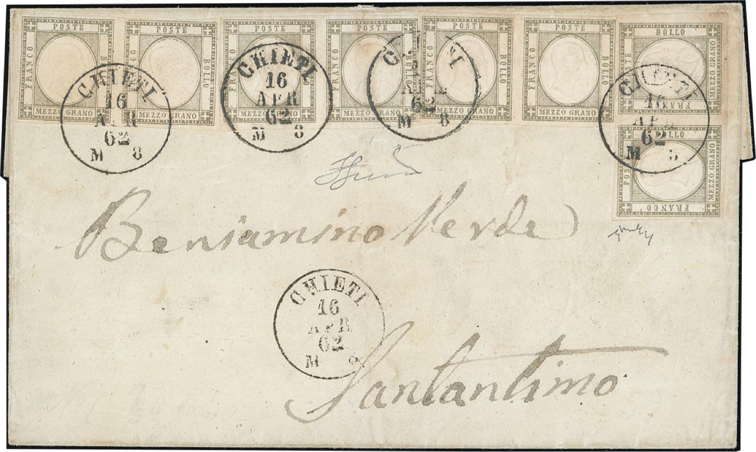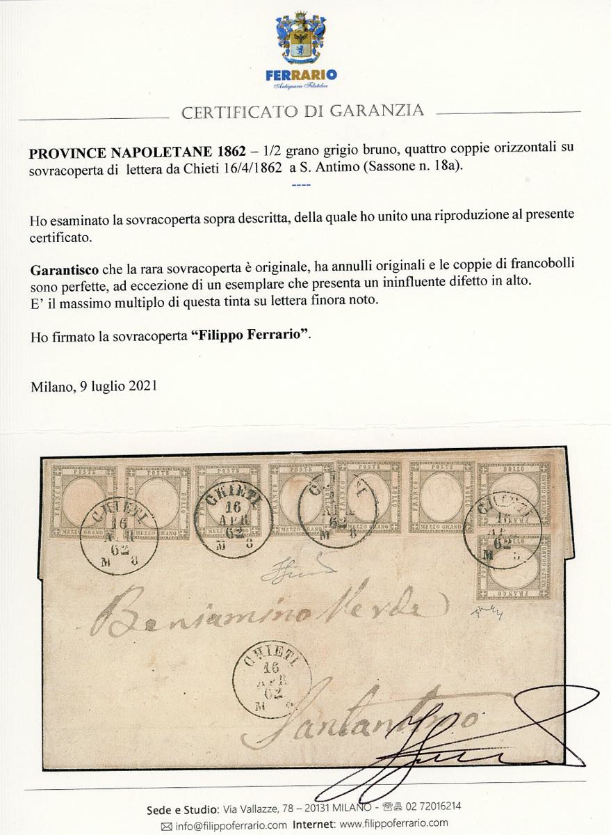 1862 - 1/2 grano grigio bruno (18a), quattro coppie orizzontali perfette, tranne un esemplare con ininfluente difetto in alto, su fresca sovracoperta di lettera da Chieti 16/4/1862 a S.Antimo, bolli d'arrivo. Eccezionale affrancatura multipla monovalore, probabilmente il massimo multiplo noto di questa tinta. Rarità. Stima di catalogo astronomica. Cert. Chiavarello, Ferrario.