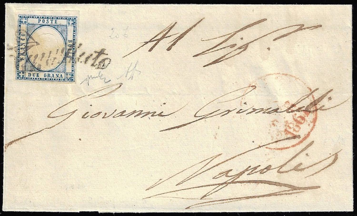 BARI, svolazzo + cerchio rosso punti 8 - 2 grana (20), perfetto, su sovracoperta di lettera del 23/3/1861 per Napoli. A.Diena, Chiavarello.