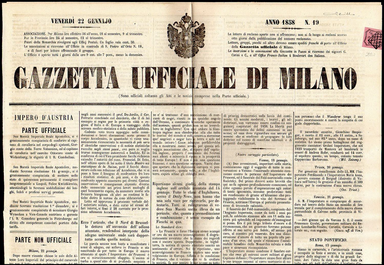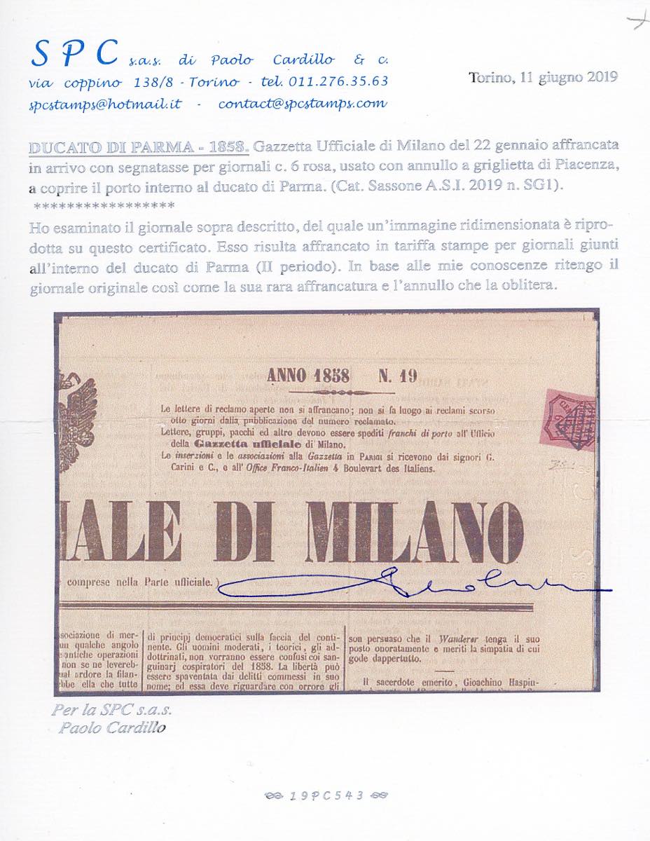 SEGNATASSE PER GIORNALI 1858 - 6 cent. rosa vivo (1), corto in alto, annullato con bollo muto a griglietta su giornale "Gazzetta Ufficiale di Milano" del 22/1/1858. Raro. Colla, cert. Cardillo.