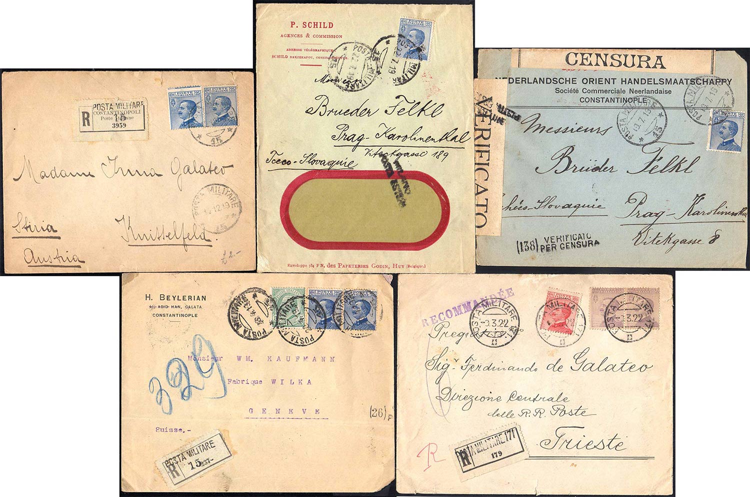COLONIE ITALIANE POSTA MILITARE 1919 - Bell'insieme di cinque lettere, di cui tre raccomandate, dagli uffici di Posta Militare di Costantinopoli. Interessanti.