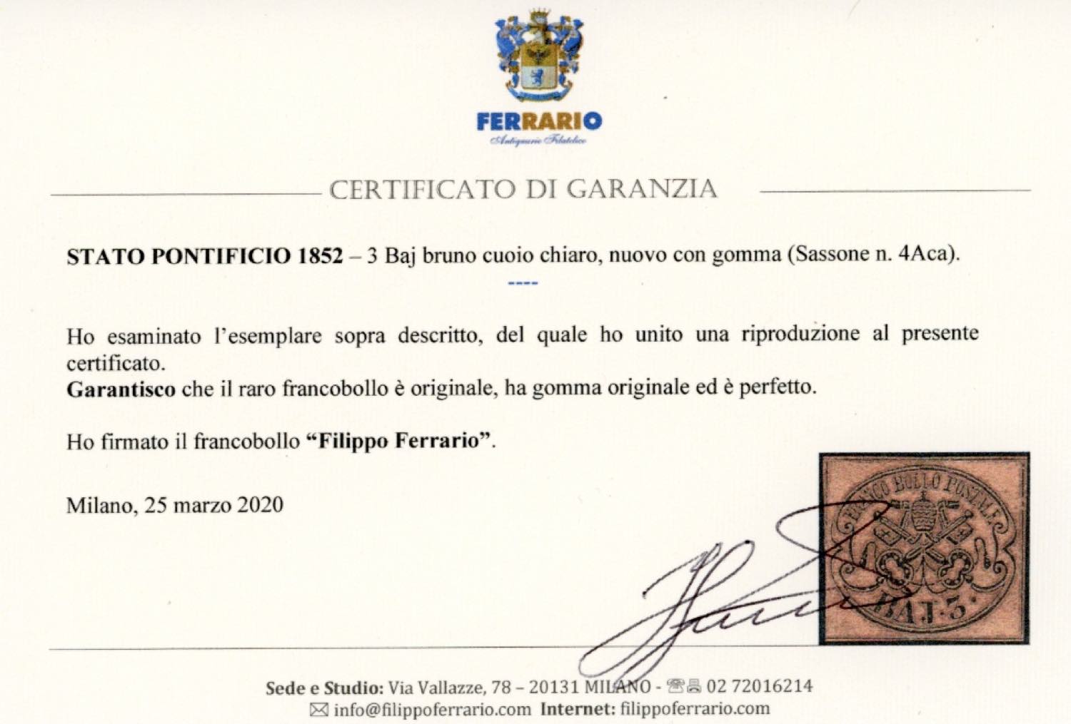 1852 - 3 baj bruno cuoio chiaro (4Aca), gomma originale, perfetto. Cert. Ferrario.