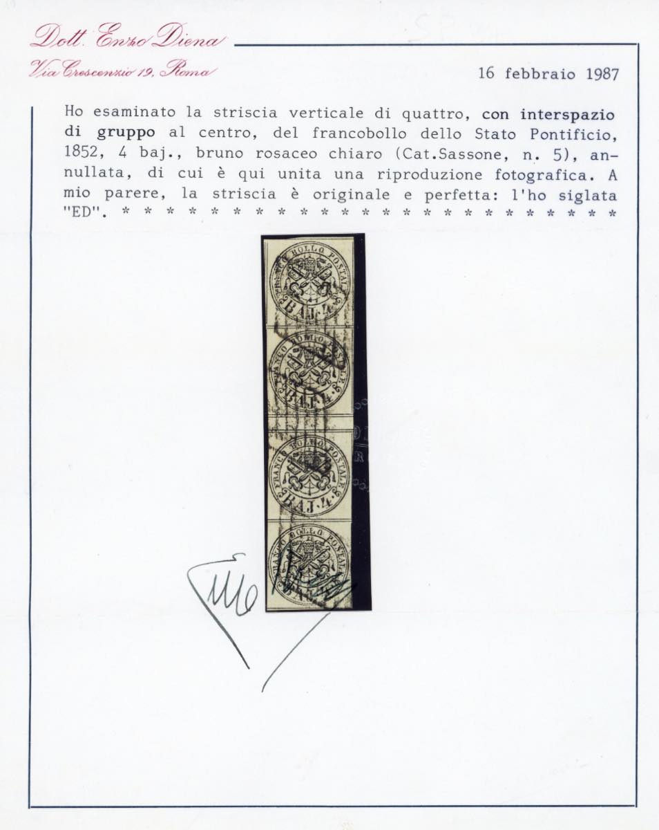 1852 - 4 baj bruno grigio chiaro (5), striscia verticale di quattro con interspazio di gruppo, usata, minimo ed ininfluente punto di assottigliamento su un esemplare. A.Diena, cert. Diena.