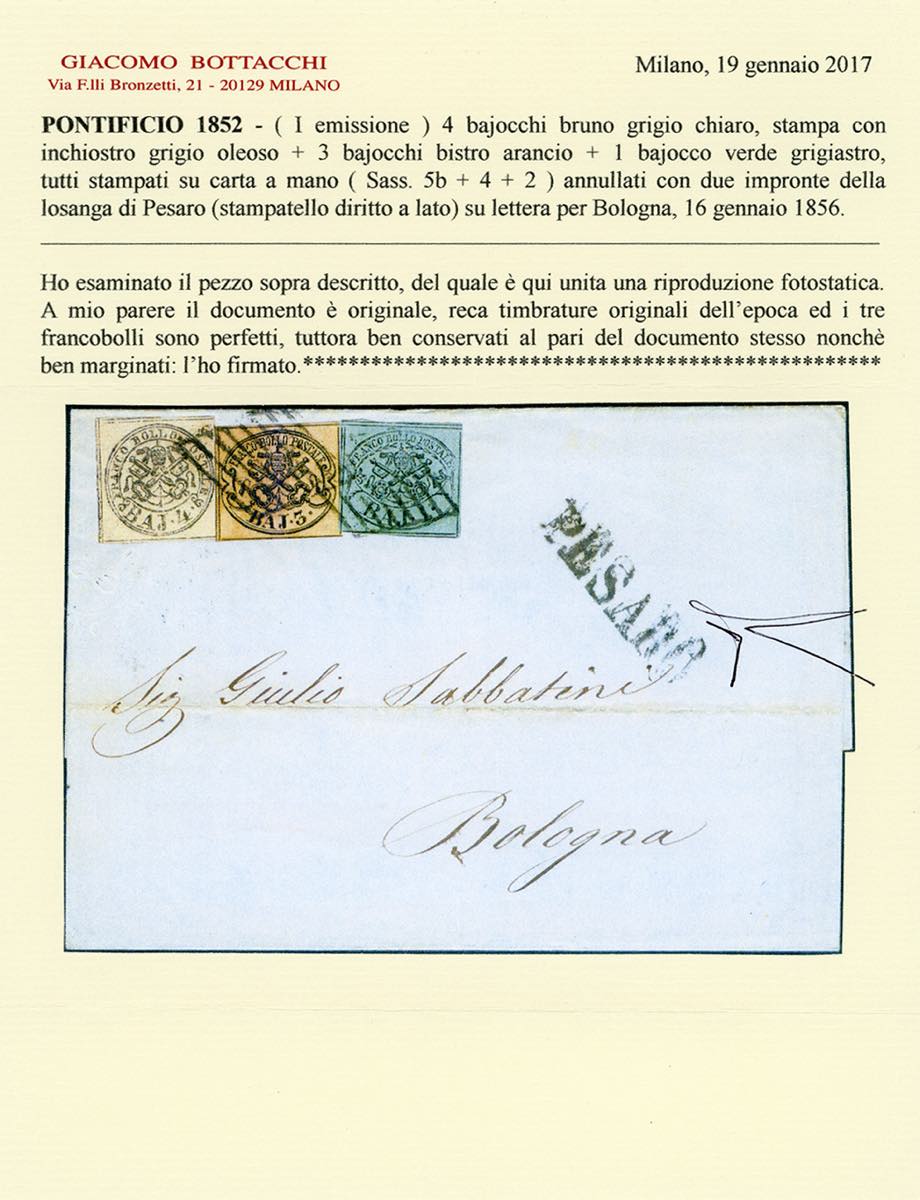 1856 - 4 baj bruno grigio chiaro, stampa con inchiostro grigio oleoso, 3 baj bistro arancio, 1 baj verde grigiastro (5b,4,2) perfetti e ben marginati, sovracoperta di lettera da Pesaro 16/1/1856 a Bologna. Pregevole affrancatura tricolore per l'interno, impreziosita dall'uso del 4 baj oleoso. Cert. Bottacchi.