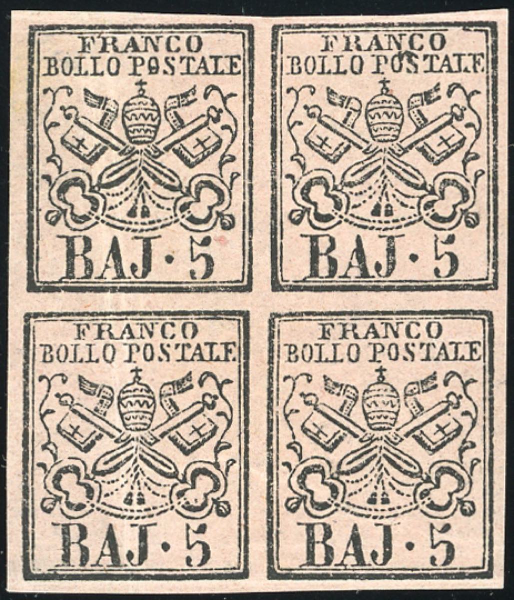 Lotto 381 - 1852 - 5 baj rosa carminio (6A), blocco di quattro, gomma ...
