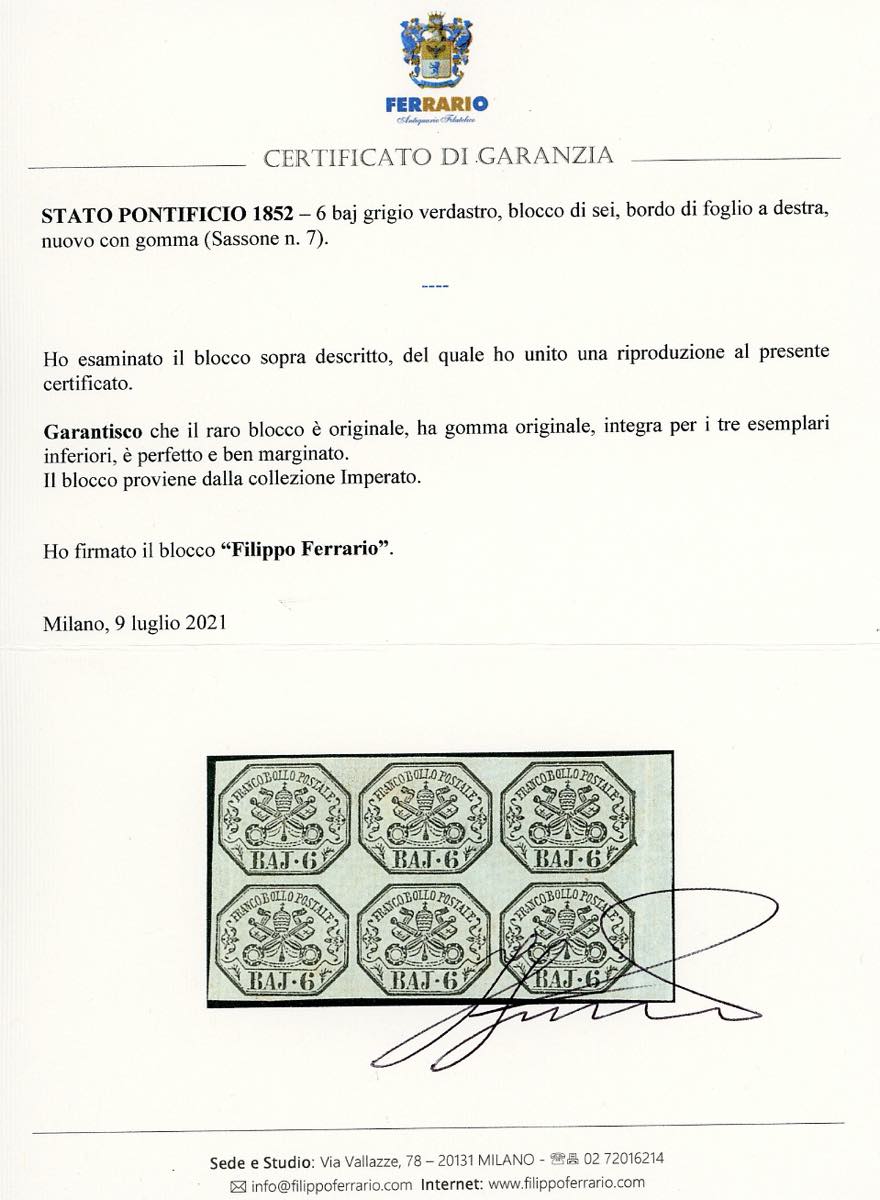 1852 - 6 baj grigio verdastro (7), blocco di sei, bordo di foglio, perfetto e ben marginato, gomma originale, integra per i tre esemplari inferiori, perfetto. Raro e di ottima qualità. Chiavarello, cert. Ferrario. Ex coll. Imperato.