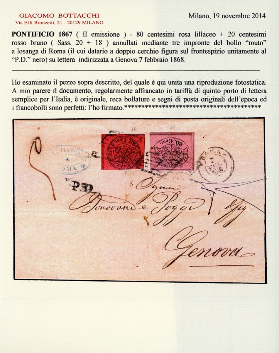 1968 - 80 cent. rosa lillaceo, perfetto ed ottimamente marginato, 20 cent. rosso bruno, buono stato (20,18), su sovracoperta di lettera di 5 porti da Roma 7/12/1868 a Genova. Molto fresca, ottimo aspetto, Cert. Bottacchi.